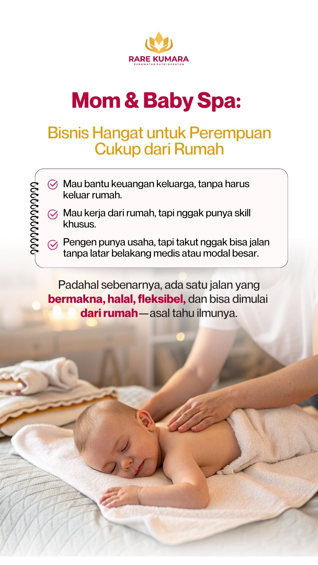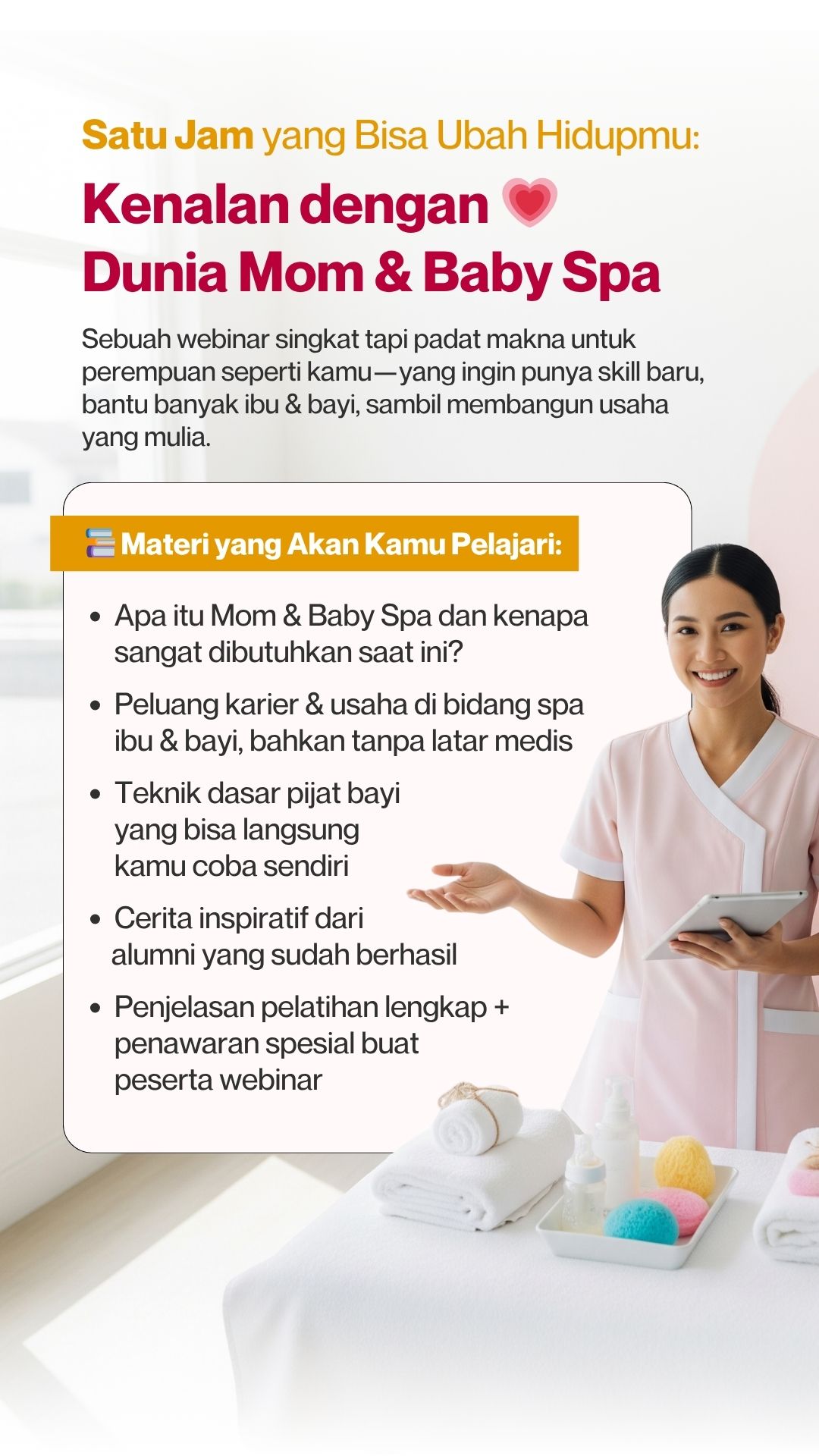 Baby Spa lagi booming! Permintaannya tinggi, tapi tenaga terapisnya masih sedikit. Lewat webinar ini, kamu bakal tahu cara mulai usaha Baby Spa dari rumah